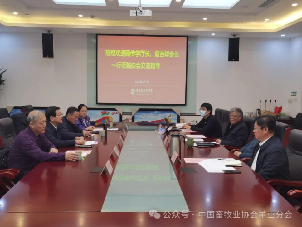 2024年3月7日,河北省農(nóng)業(yè)農(nóng)村廳一級(jí)巡視員顧傳學(xué),河北省畜牧業(yè)協(xié)會(huì)會(huì)長趙吉祥, 河北省羊產(chǎn)業(yè)創(chuàng)新團(tuán)隊(duì)首席敦偉濤研究員,河北省畜牧業(yè)協(xié)會(huì)羊業(yè)分會(huì)執(zhí)行會(huì)長閆振富,河北衡水志豪畜牧科技有限公司總經(jīng)理王媛一行來訪協(xié)會(huì),就2024年第十二屆羊業(yè)發(fā)展大會(huì)申辦事宜進(jìn)行交流,協(xié)會(huì)秘書長沙玉圣、副秘書長劉強(qiáng)德、羊業(yè)分會(huì)執(zhí)行會(huì)長杜立新、羊業(yè)分會(huì)秘書長趙印出席會(huì)議。